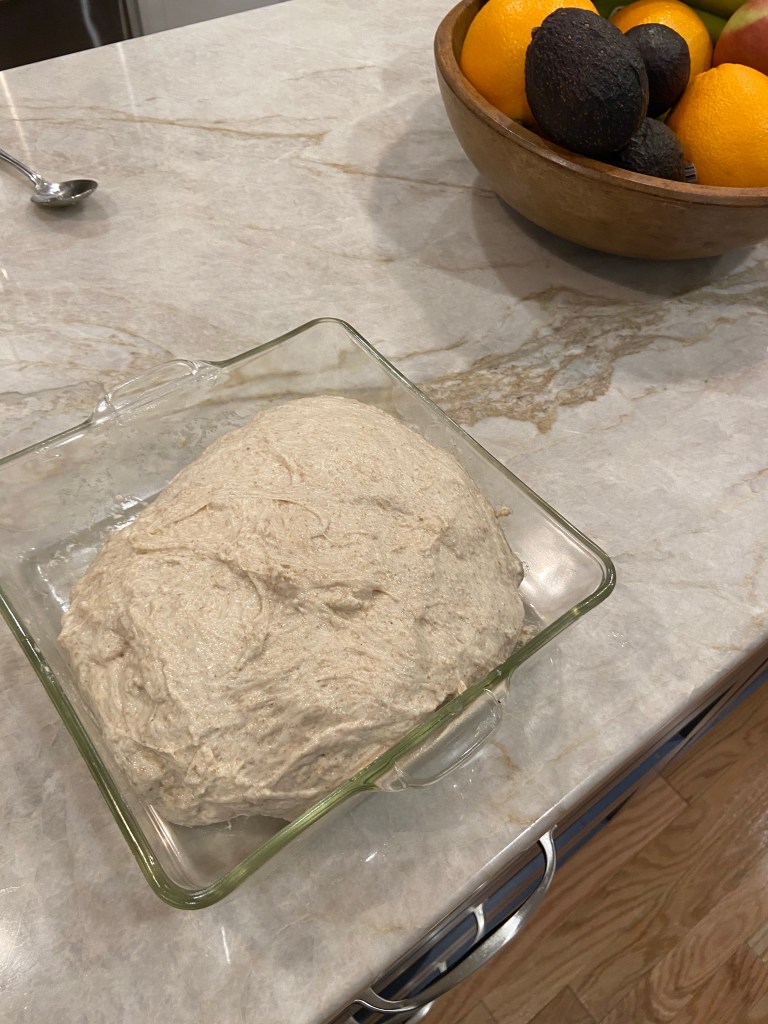 After the wedgies, transfer the dough to a different bowl. (For this blog, I put the dough in a baking dish to make it easier to see.) Let the dough rest 30 minutes.