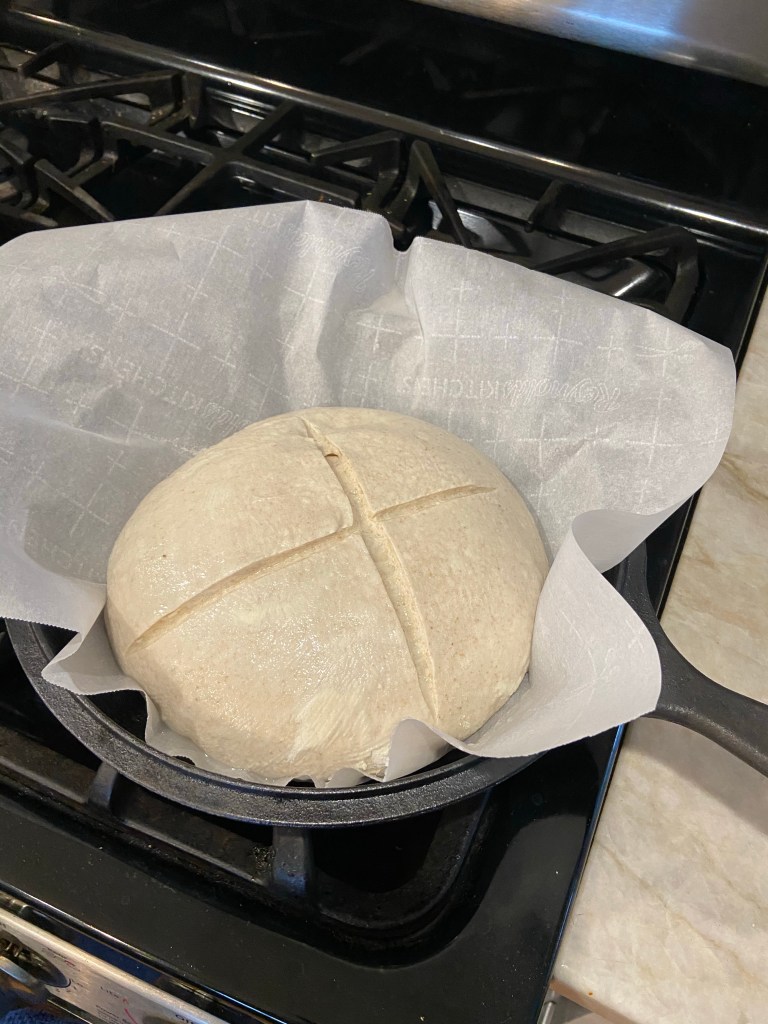 Sloppy Baker’s Tip: I like seasoned cast iron for baking bread. It’s cheap and safe for high temps. Don’t use expensive enameled cast iron like Le Creuset; the enamel will crack if you preheat an empty pot at high temperatures.