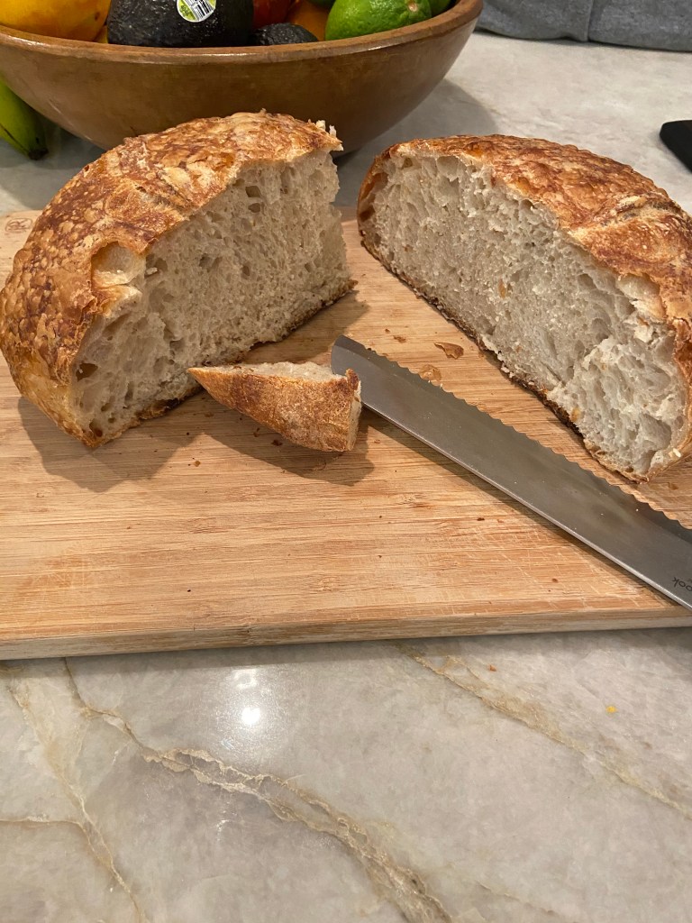 After 40 minutes of baking, check your bake. When the loaf is a dark caramel color, remove it from the oven and pot and allow to cool on a rack for at least three hours.
