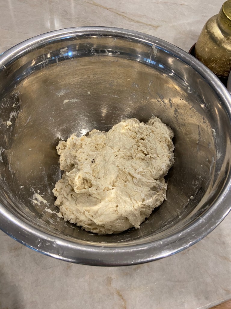 Once you’ve squeezed and pinched the dough to incorporate the salt and water, it’s time to start activating the gluten in the dough.