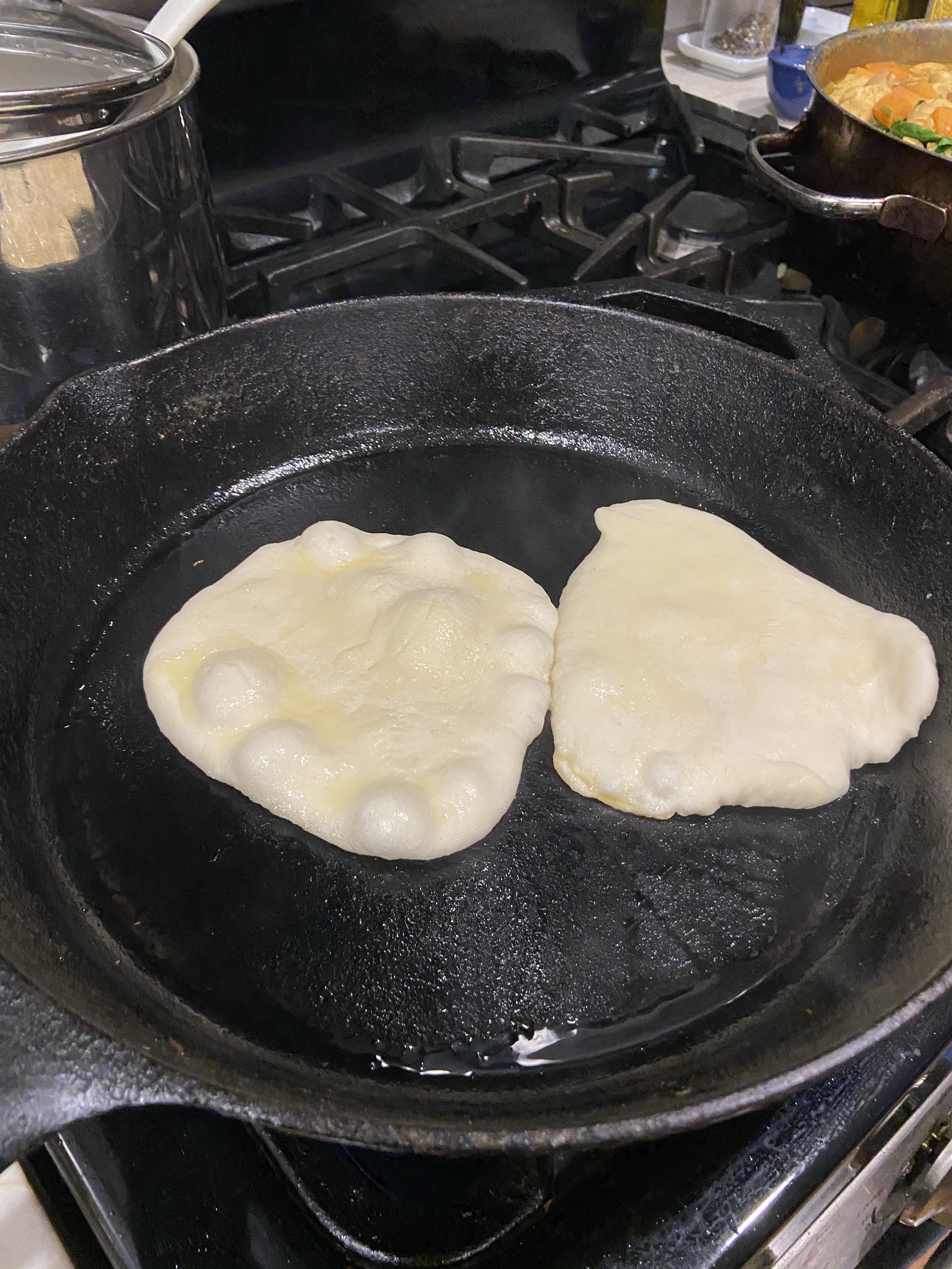 While the skillet is heating and the butter is melting, use a rolling pin to roll each ball until it is about 1/4 inch thick and 6 inches diameter. I don’t worry too much about the shape; some naan are round, some are oval, and others are modern art. They all taste good.