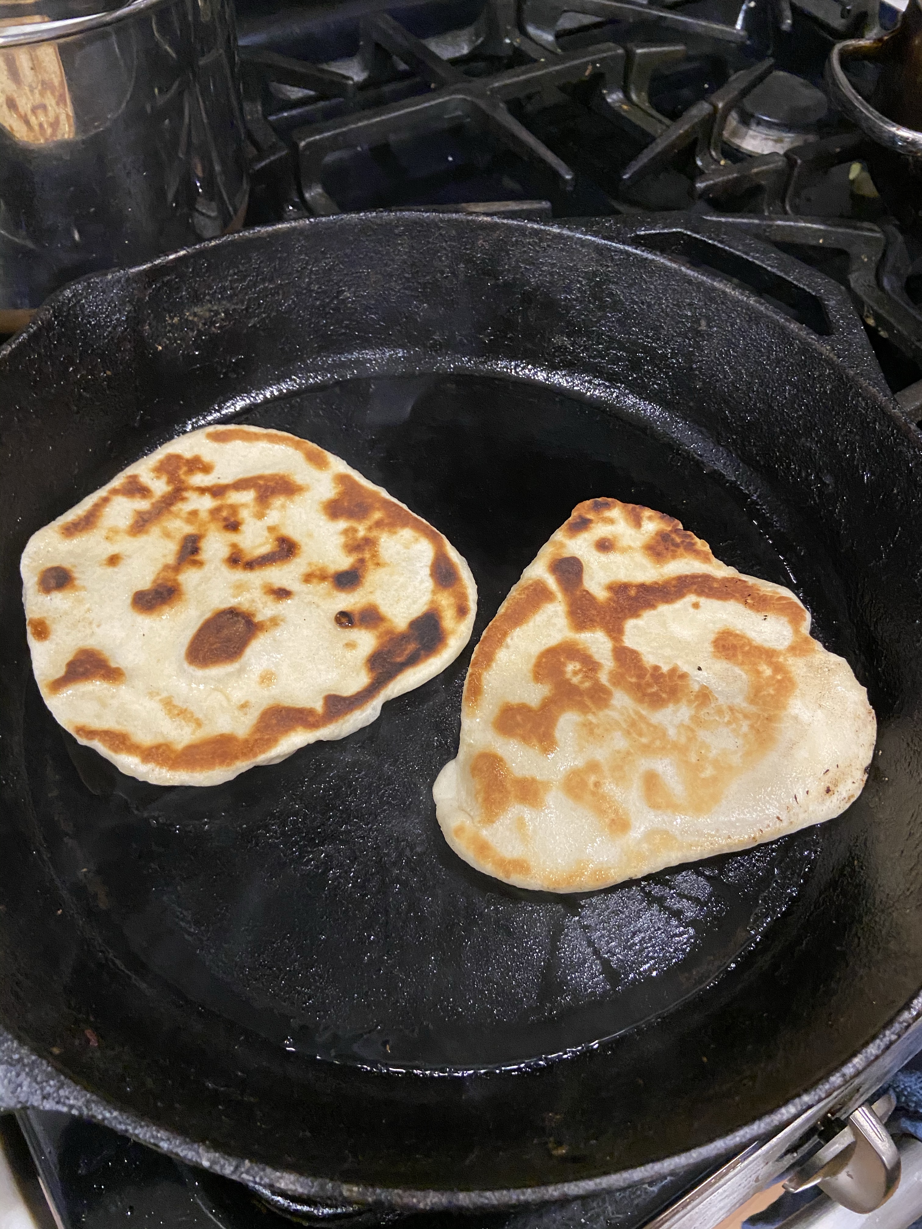 Remove the naan from the skillet and repeat until all 12 naan are cooked.